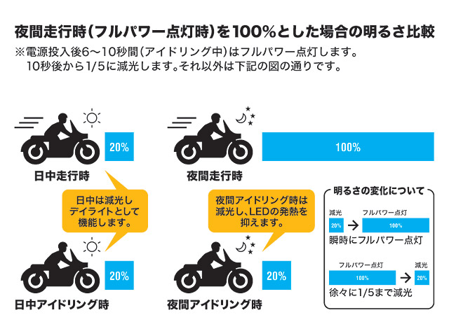 ディマーセンサー(自動調光システム)を搭載、REVセンサー(エンジン回転信号センサー RSE-01)を採用しております。日中周囲の明るさに反応してLEDの発光量を自動で減光しますので、日中はデイライトとして機能し、夜間は28Wフルパワーで点灯します。(減光状態との差は5倍です。)
